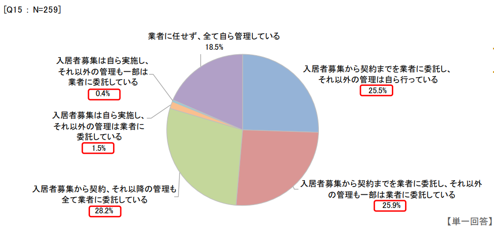 入居者募集から契約までを自ら行うのはハードルが高いため、この部分を含めた業務について外部委託している大家さんが多いことが分かります。